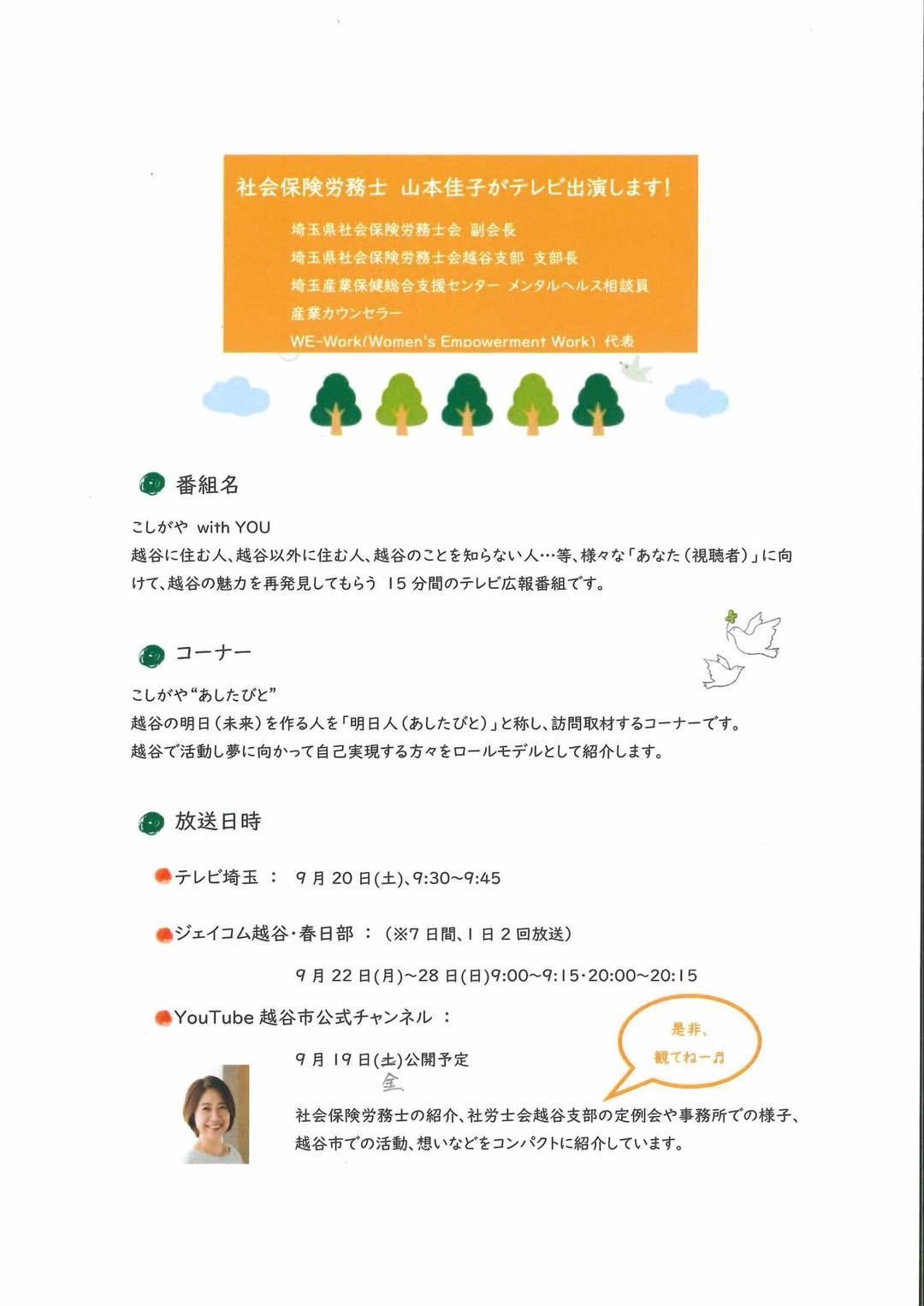 埼玉県社会保険労務士会越谷支部 支部長 山本佳子氏がテレビ出演します!